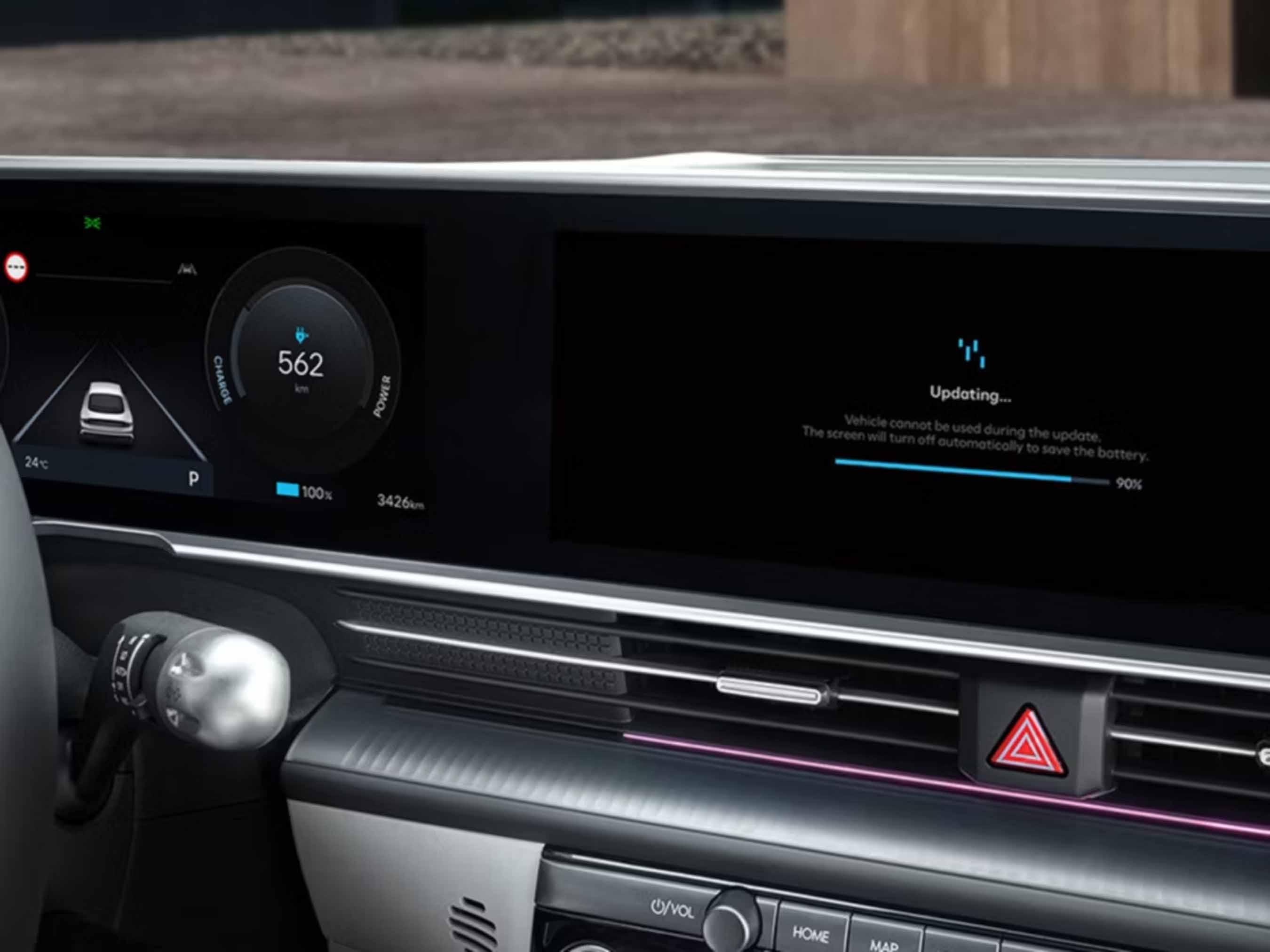 Le système Connected Car Navigation Cockpit de Hyundai dispose d’un écran élégant combinant un écran d’informations conducteur de 12,3 pouces et un écran tactile infotainment de 12,3 pouces. Il prend en charge les mises à jour logicielles Over-the-Air ainsi qu’Apple CarPlay™ et Android Auto™ sans fil, permettant de refléter facilement votre smartphone et votre musique sur le grand écran, sans aucun câble.