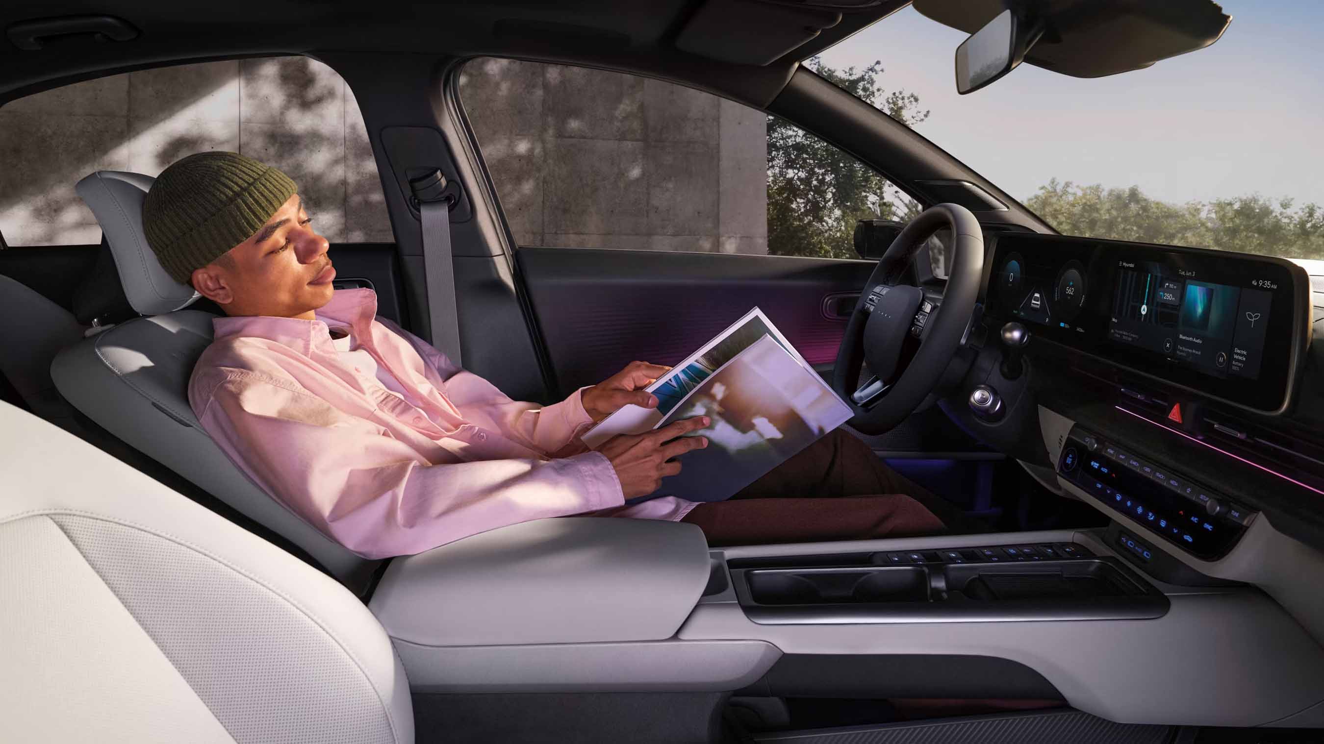 Sièges relaxants haut de gamme à l'intérieur de la berline électrique Hyundai IONIQ 6.